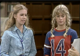 Sue Ann announces that she’s moving in to Blair’s room (I thought that they were already roommates?), while Cindy jumps rope to let off steam. Molly, who has confronted Sue Ann, helps Sue Ann admit that she’s just pissed off and jealous because Cindy is better than she is. Natalie and Nancy confront Cindy, and we learn that she was happy with baseball and tennis until Sue Ann got her into running. Putting the plausibility of an all-girls’ school having a baseball team, aren’t all three of those spring sports? I know Cindy is a super-jock, but I’ve never heard of an athlete earning three letters in the same season. Anyway, Cindy thinks Sue Ann should just drop out of the race, because she’s not as fast as Cindy is! Oh noes!