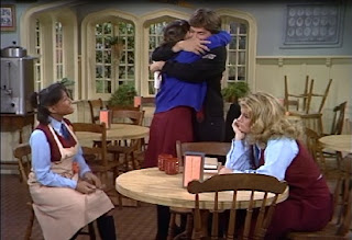 The next day in the cafeteria, Jo looks under tables. Mrs. Garrett tells her that Bob called, and Jo doesn’t seem to care. She responds to Mrs. Garrett’s question whether she’s looking for something with, “No, I’m just lookin’ for something.” Blair flits in, prancing with joy because apparently she and her simulated husband are getting a divorce. Jo snits about some people not being able to make a commitment, and takes her search to the lounge.